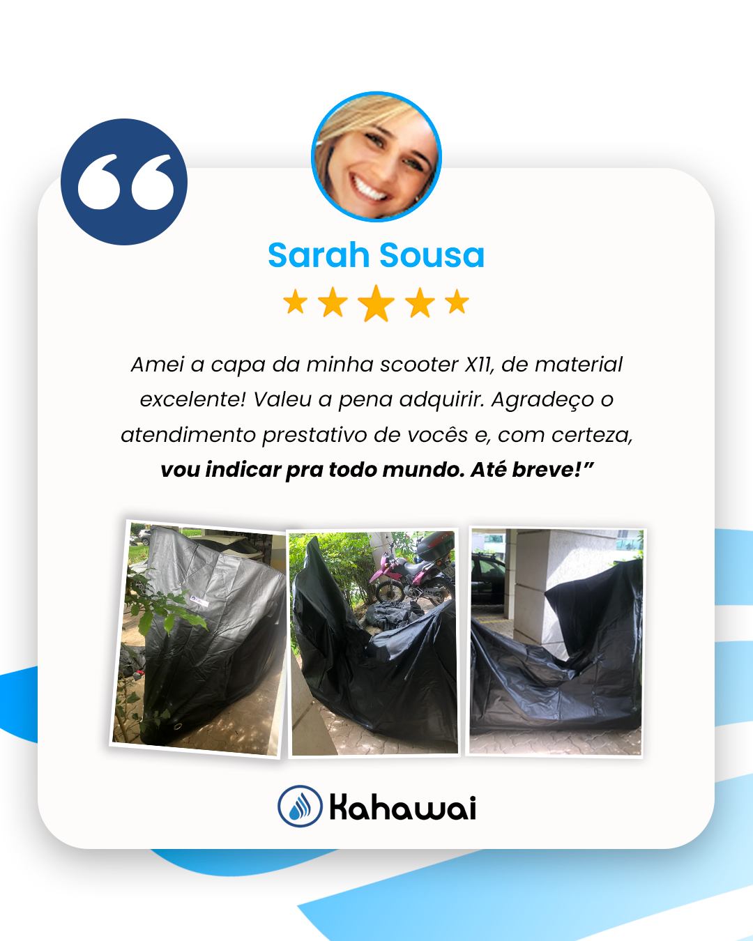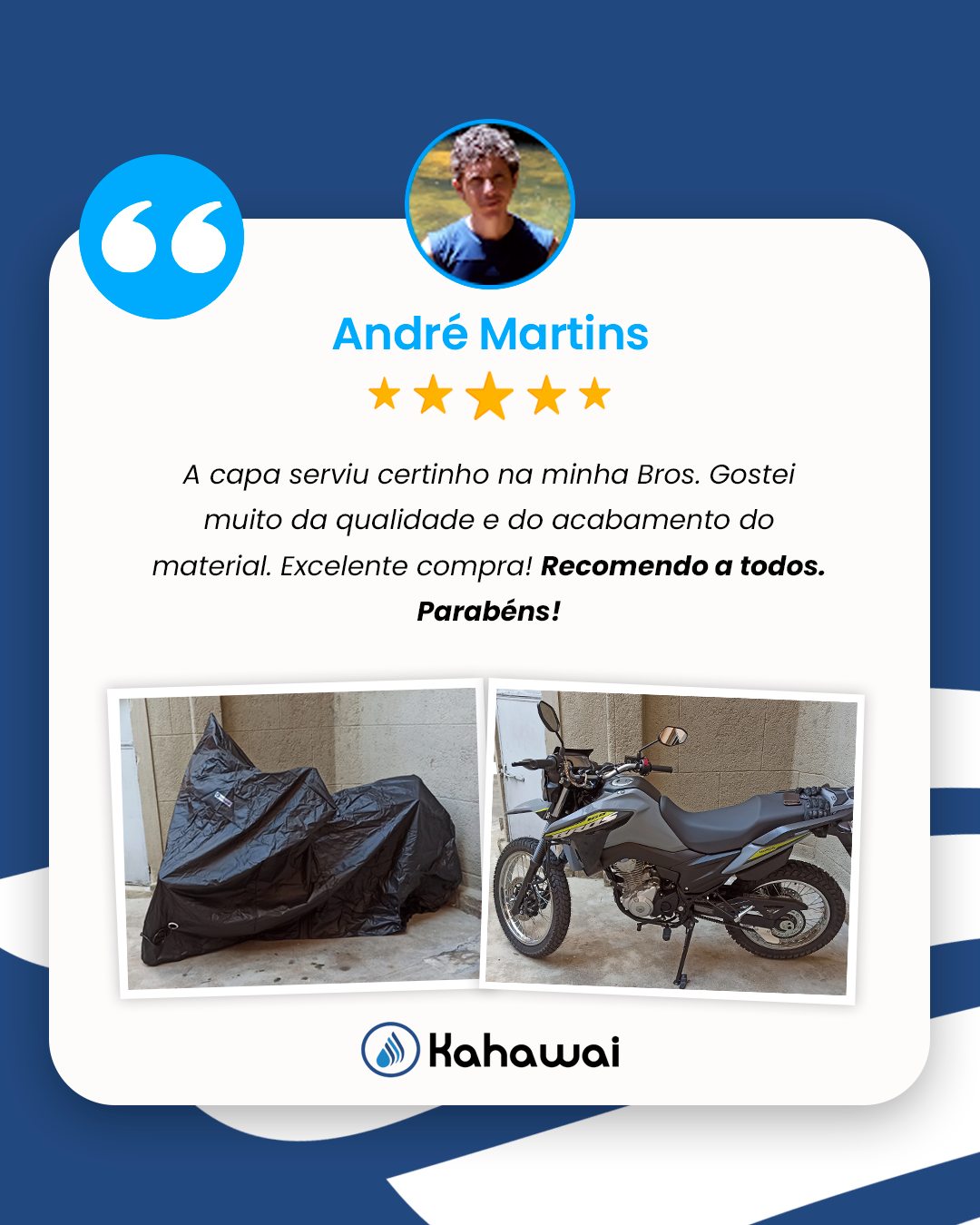 Os ilhoses que ficam na frente da capa deveriam ser um pouco mais para trás. Tendo em vista os ventos muito fortes atuais, seria interessante também ter ilhoses para firmar nas rodas traseiras. A bolsa que enviam para guardar a chave, deveria ser para guardar a antena, que não pode estar no lugar quando se coloca a capa. Fora isso, ótima. Meus parabéns
