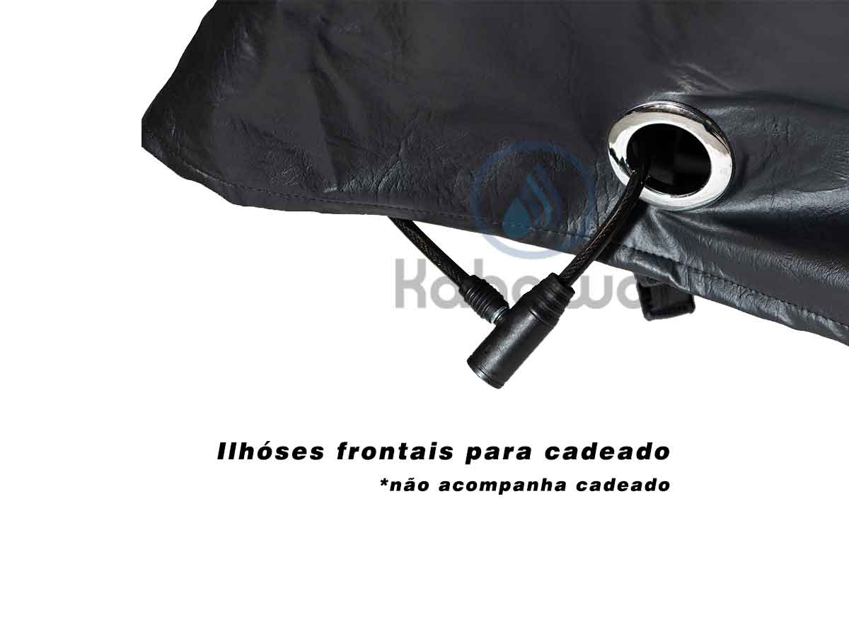 Com camada de proteção UV para raios solares, não resseca e não permite ação do sol sobre a moto. Além disso, possuem argolas frontais para que possam ser utilizadas correntes antifurto.