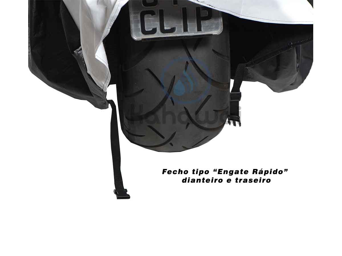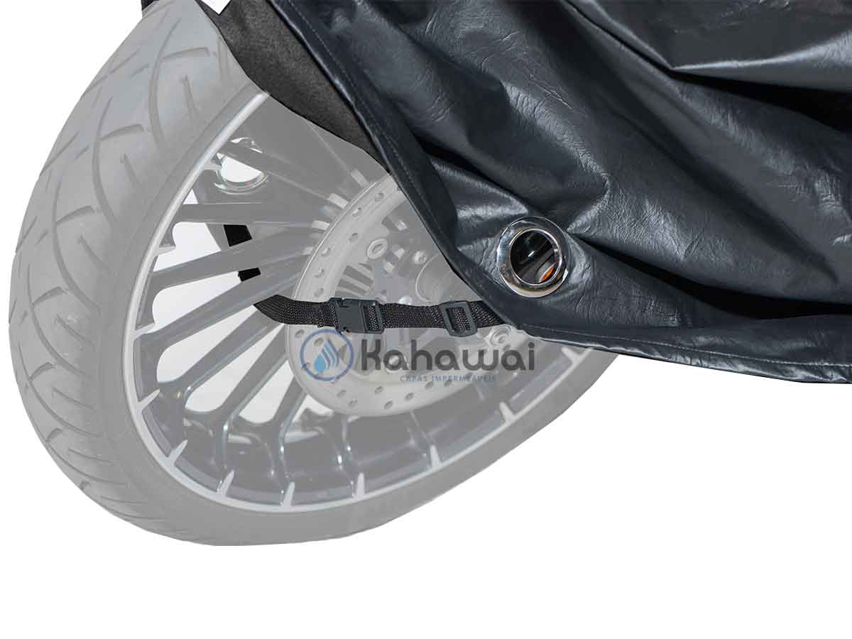 Para garantir que a sua capa de moto Kahawai não irá voar com ventanias, possuem duas presilhas com engates rápidos sendo uma na parte dianteira e outra na parte traseira da moto.