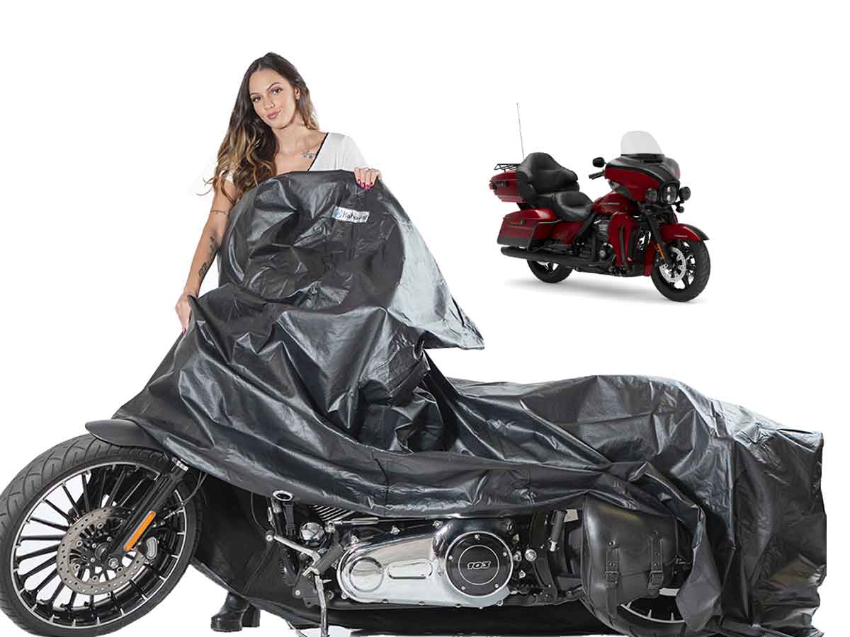 Capa Cobrir Moto Impermeável Harley Ultra Limited, antichamas, com camada de proteção UV e ilhoses para cadeado. Forro macio que não risca a moto.