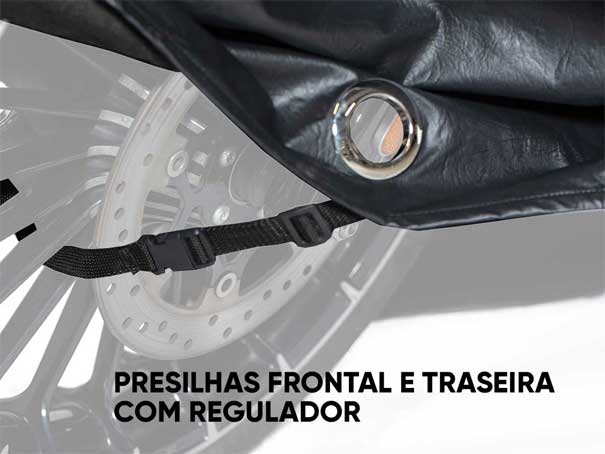 8. Vem com presilhas modelo “engate rápido” para evitar que a capa se solte do veículo na parte traseira e frontal da capa de cobrir moto;